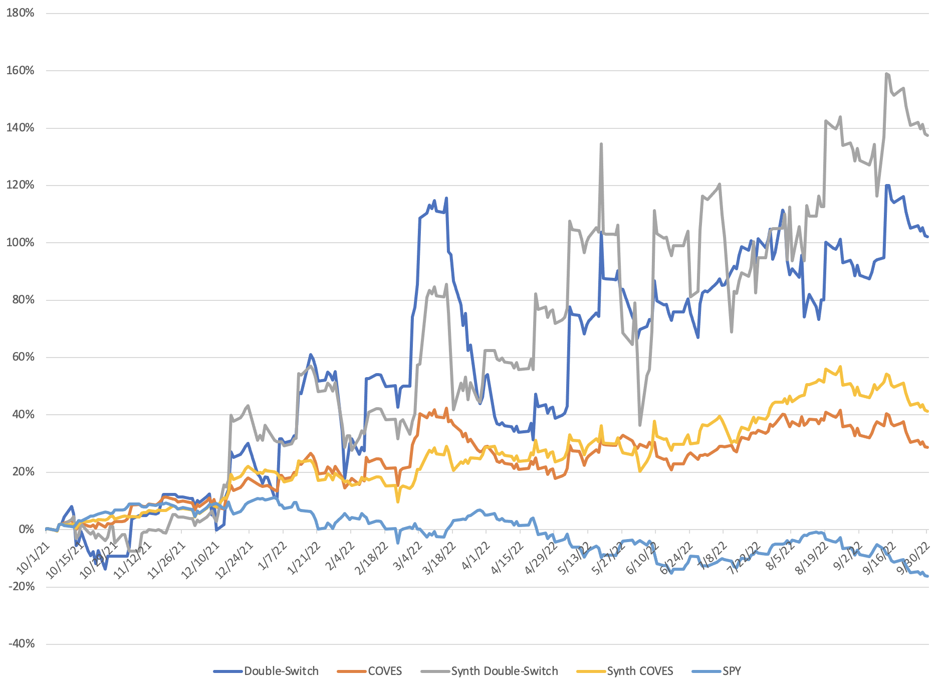 In fact, we are seeing a flip-flop between the switches and COVES: the COVES variants had better Sharpe ratios than their double-switch counterparts back in April, but that trend seems to have been reversed hard in the subsequent six months. This is likely driven by the bottom falling out on SPY, since COVES is a 70:30 split between SPY and the double-switch, rebalanced quarterly. This provides a very useful insight, as the gains in SPY likely propelled COVES/Synth COVES upward in the first six months, while the double-switches have been doing the heavy lifting on keeping COVES/Synth COVES from sinking in the back half of the year. There may be some fine-tuning that can be done in this regard: for instance, perhaps altering the SPY:switch ratio each quarter based on recent trends. A move over to a 50:50 SPY:double-switch in April would’ve likely provided a much better return in the back half of the year, but it would difficult to assure that this momentum carries through an entire quarter of market performance.
